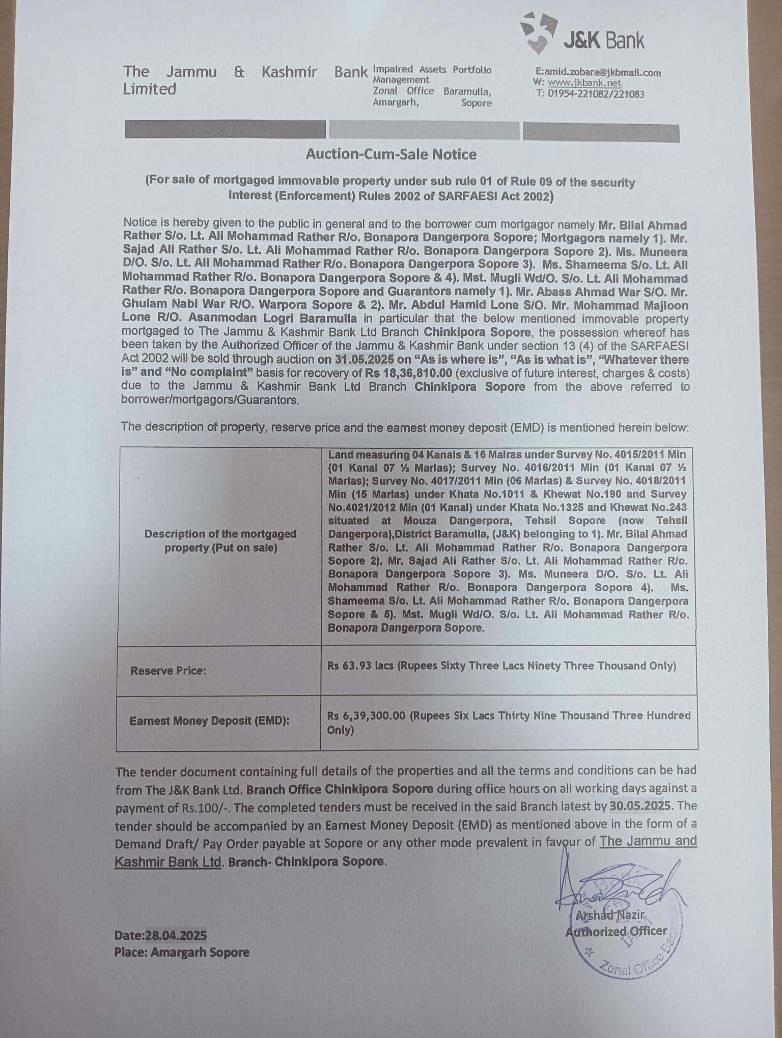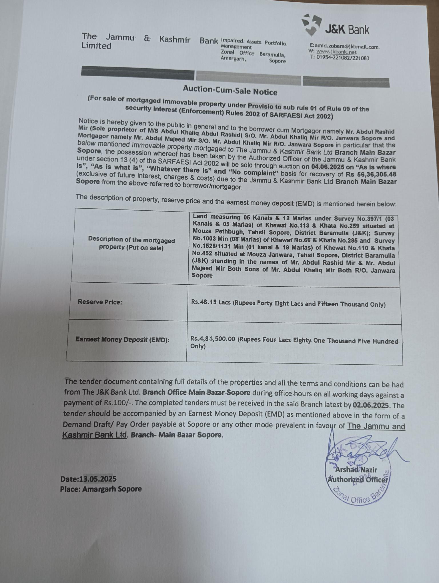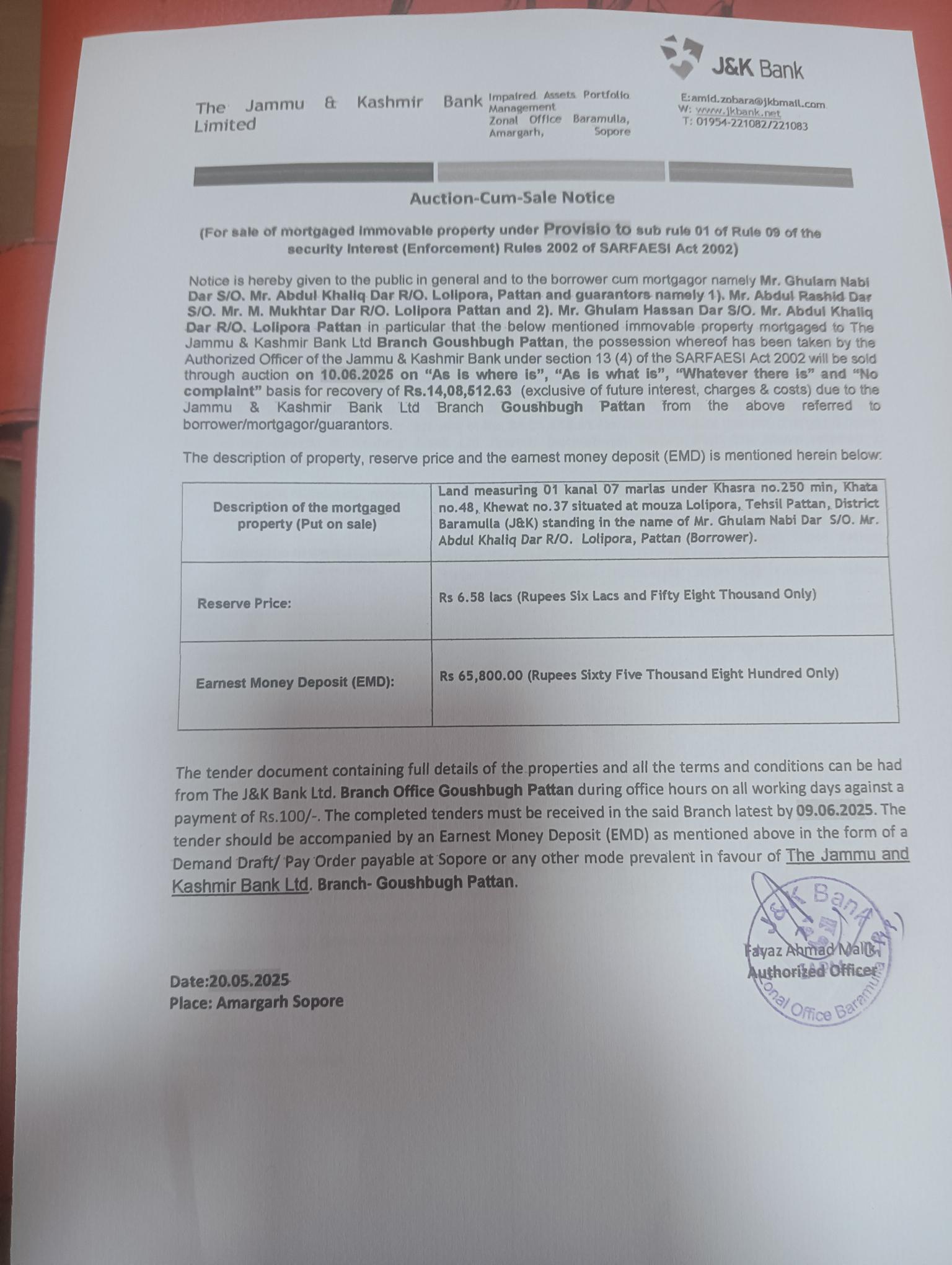 Land Auction Notice: M/S Ab Khaliq Ab Rashid of BU Main Bazar Sopore