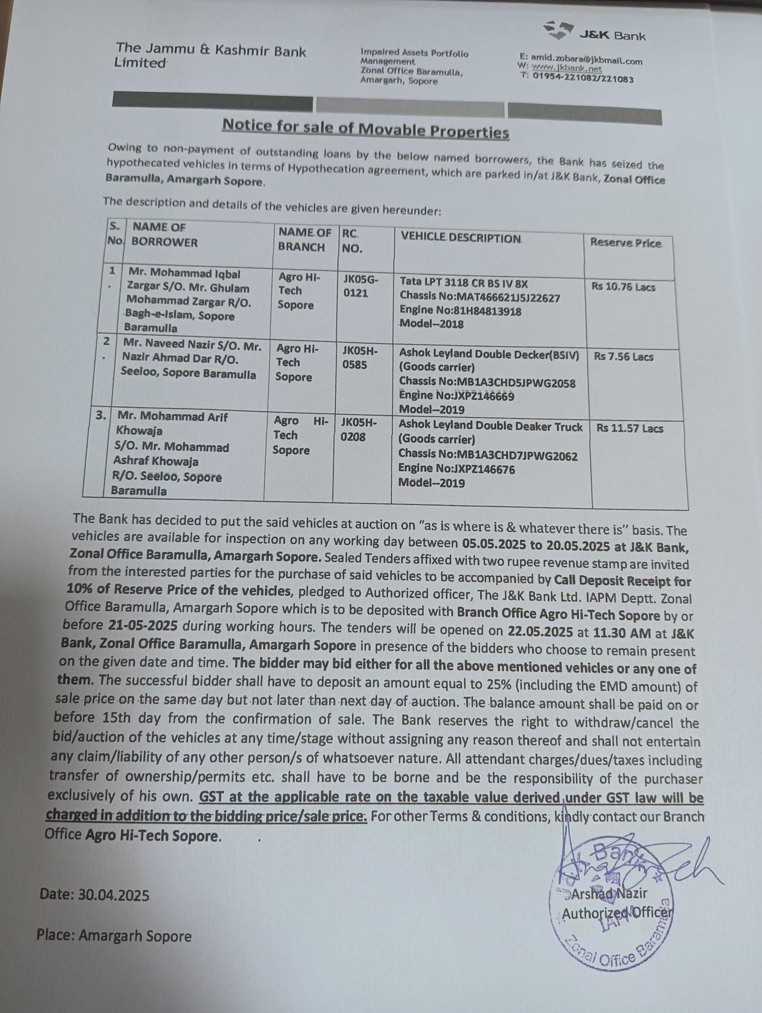 Vehicle Auction Notice: Mr. M Iqbal Zargar, Mr. Naveed Nazir & Mr. M Arif Khawaja of BU Agro Hitech Sopore