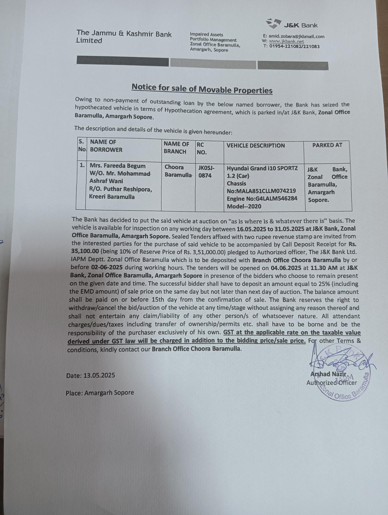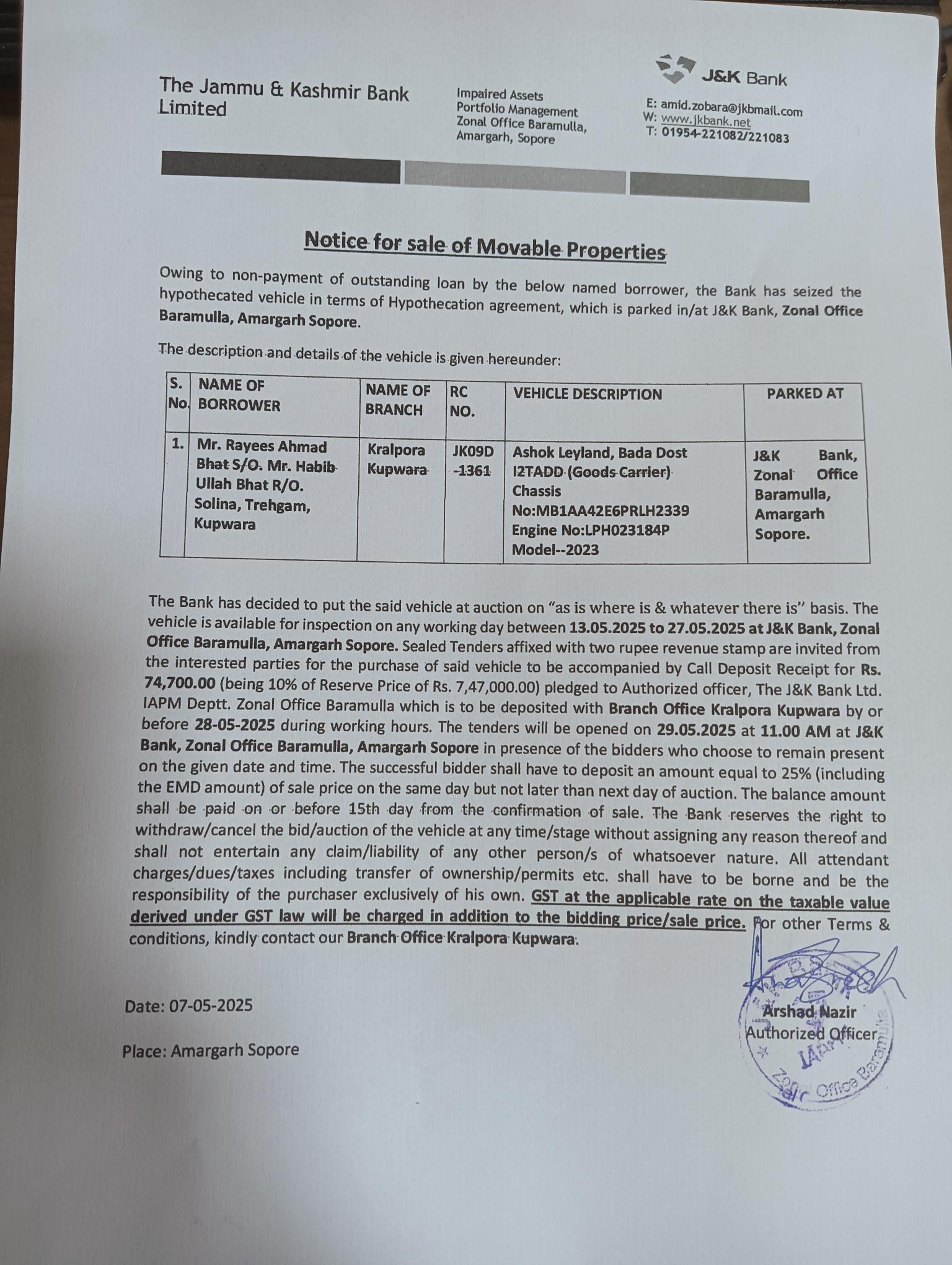 Vehicle Auction Notice: Mr. Rayees Ahmad Bhat of BU Kralpora Kupwara